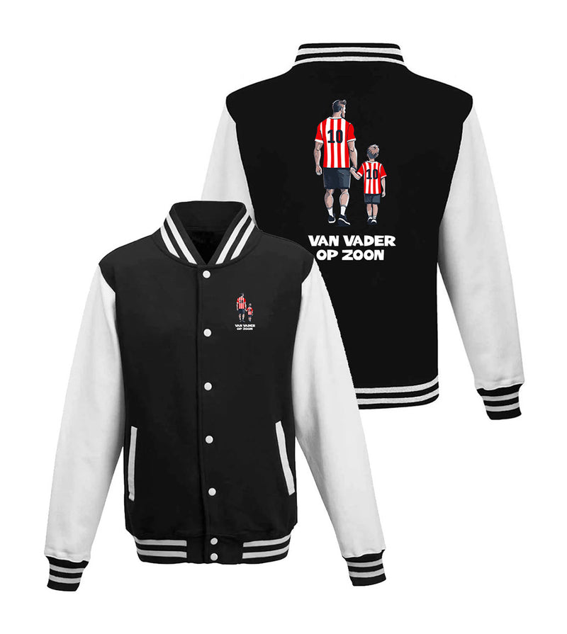 Dit is de Van Vader op Zoon Varsity jacket van Eindhoven Fanshop. In het rood of zwart en in uw maat zijn deze jassen verkrijgbaar. De jassen hebben een normale en unisex pasvorm.